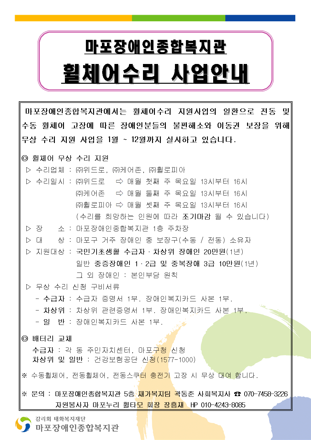 2015년 휠체어 수리지원 사업 안내문 입니다 문의: 070-7458-3226 곽동준 사회복지사