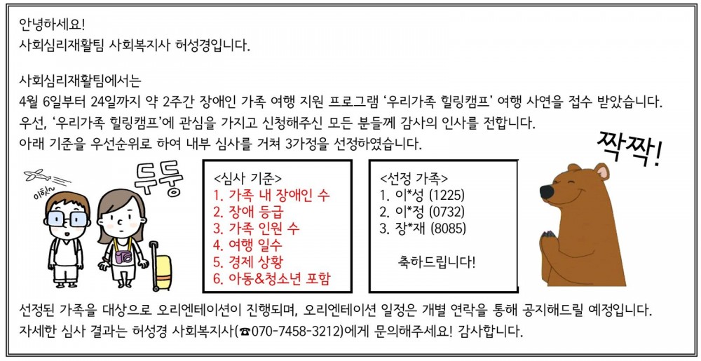 지원해주신 분들께 감사드립니다~. 선정되신 가족분들 모두, 가족과 즐거운 추억 쌓으시기 바랍니다.
