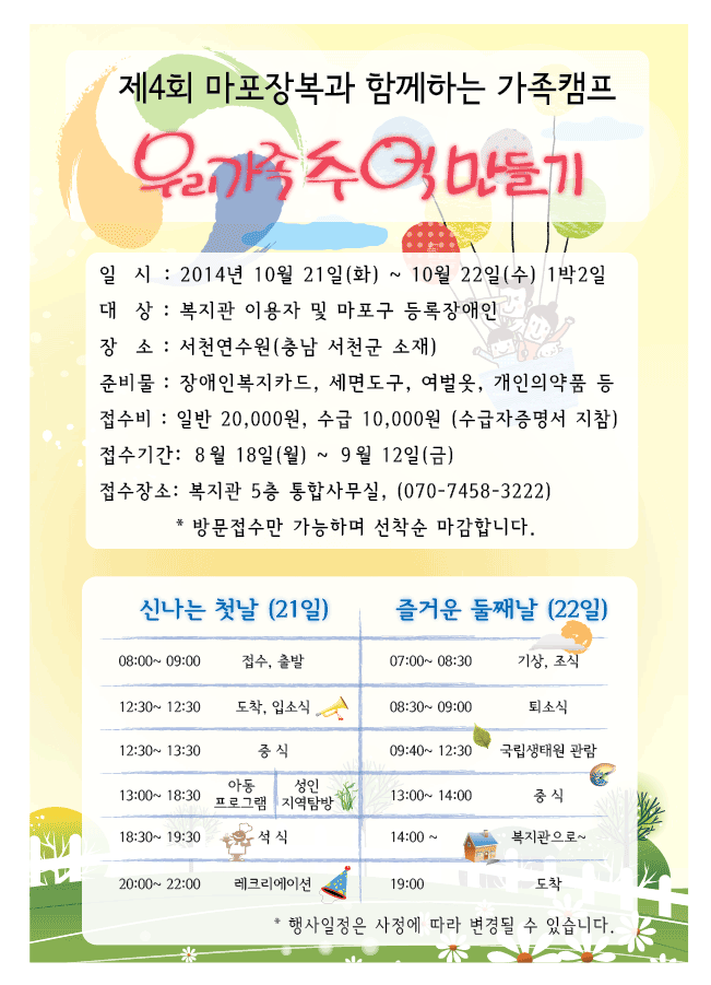 마포장애인종합복지관은4회 마포장복과 함께하는 가족캠프 우리가족 추억만들기1021()~22() 1박 2일간, 충남 서천군에 위치한 서천연수원에서 진행할 예정입니다.