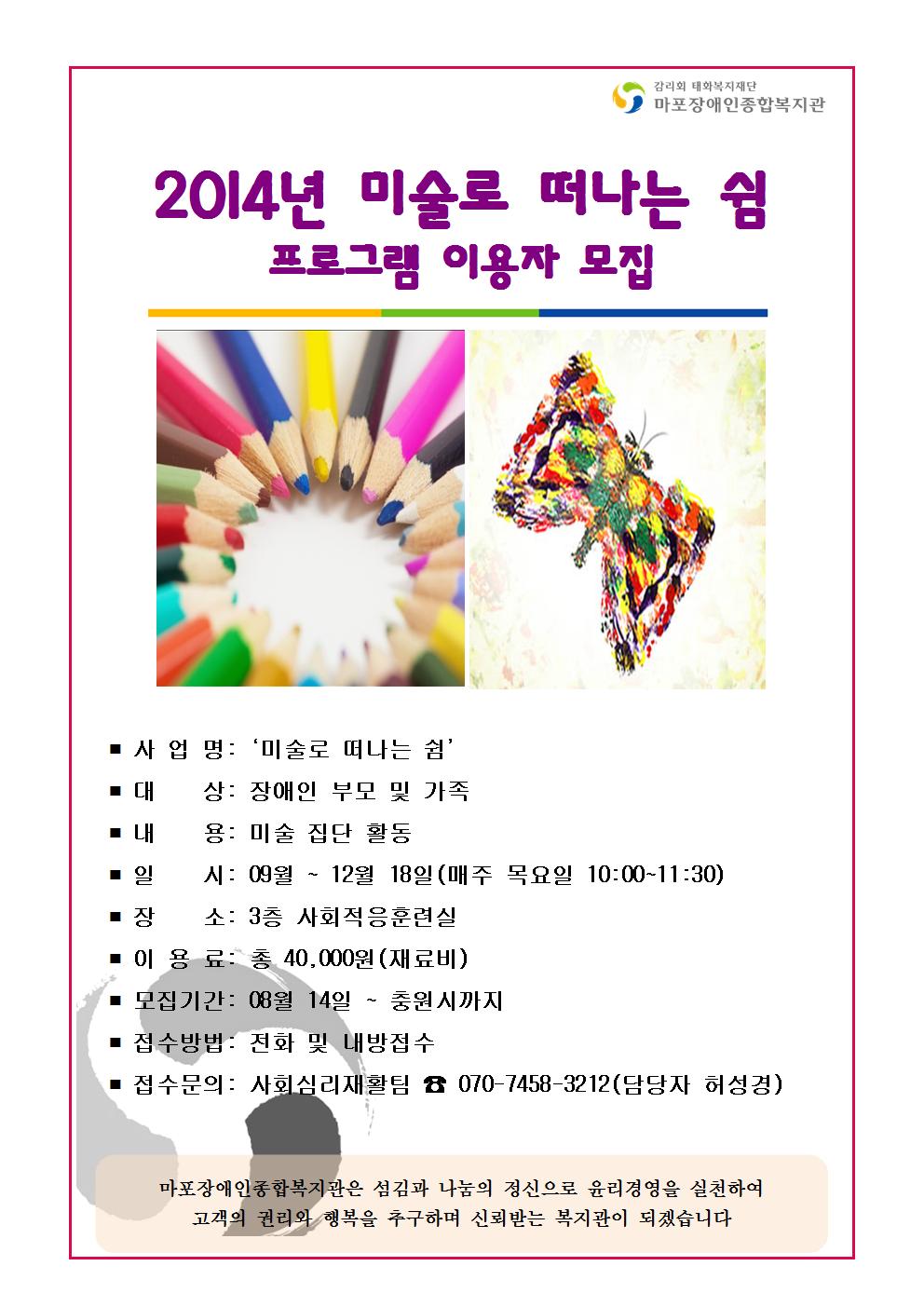 부모미술 '미술로 떠나는 쉼' 이용자 모집 페이지 정보 작성자 허성경 댓글 0건 조회 8,636회 작성일 14-09-22 18:10 목록 본문 장애인 부모 및 가족을 대상으로 진행되는 집단 미술 프로그램 '미술로 떠나는 쉼' 많은 관심과 신청 부탁드립니다.* 문의 및 접수 사회심리재활팀 허성경 (070-7458-3212) 목록 이전글 장애인이동목욕 간호사 채용 14.09.26 다음글 추석연휴 안내 14.08.29 댓글 0 댓글목록 등록된 댓글이 없습니다.