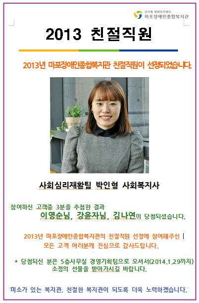 2013년 친절직원 발표 페이지 정보 작성자 오은경 댓글 2건 조회 12,888회 작성일 14-01-02 10:16 목록 본문 목록 이전글 치료바우처 재활치료사 모집 공고 14.01.06 다음글 취학지원반 참가자 모집 13.12.18 댓글 2 댓글목록 오은주님의 댓글 오은주 작성일 14-01-02 17:14 축하드립니다.^^ 축하드립니다.^^ 류림화님의 댓글 류림화 작성일 14-01-17 10:58 시간이 좀 지났지만, 축하드립니다~ ^^ 시간이 좀 지났지만, 축하드립니다~ ^^