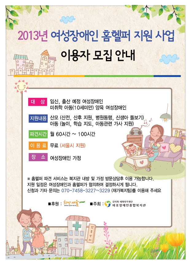 홍보문을 참조 하셔서 홈헬퍼 도우미가 필요한 여성장애인 분들의 관심과 신청 바랍니다.