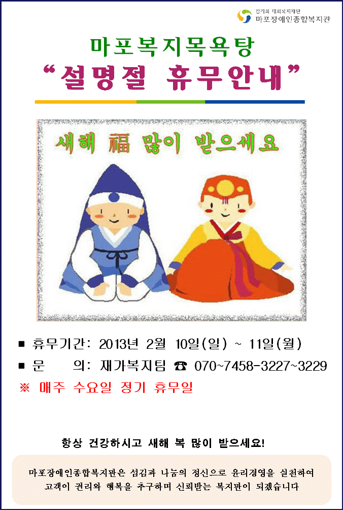 마포복지목욕탕 설 명절 휴무 안내 페이지 정보 작성자 박진미 댓글 0건 조회 9,272회 작성일 13-01-31 14:48 목록 본문 목록 이전글 2013년 여성장애인 지원사업 이용자모집 13.02.01 다음글 마포복지목욕탕 시간제 보조 근무자 채용 공고 13.01.23 댓글 0 댓글목록 등록된 댓글이 없습니다.