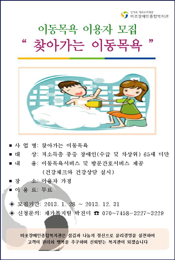 2013년 이동목욕 이용자 모집 페이지 정보 작성자 한현정 댓글 0건 조회 9,304회 작성일 13-02-01 18:47 목록 본문 많은 관심과 참여 바랍니다 목록 이전글 골프 아카데미 신규 이용자 모집 13.02.05 다음글 2013년 여성장애인 지원사업 이용자모집 13.02.01 댓글 0 댓글목록 등록된 댓글이 없습니다.