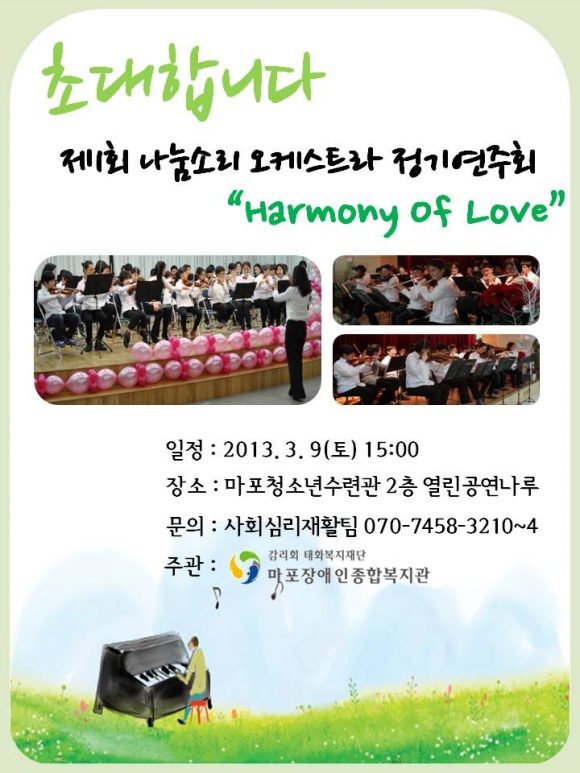 제1회 나눔소리 오케스트라 정기연주회 안내 페이지 정보 작성자 박인형 댓글 0건 조회 10,219회 작성일 13-02-12 15:10 목록 본문 제1회 나눔소리 오케스트라 정기연주회 "Harmony Of Love"가 진행됩니다.많은 참여와 관심 바랍니다. 목록 이전글 2013년 1학기 실습생 추가모집 13.02.13 다음글 2013년 1학기 실습생 모집 결과 안내 13.02.12 댓글 0 댓글목록 등록된 댓글이 없습니다.