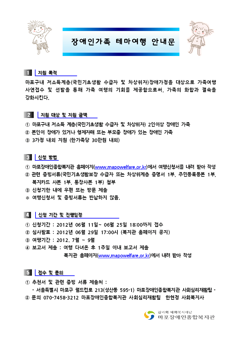 우리복지관에서는 아래와 같이 장애인가족 테마여행 지원 사업을 실시합니다