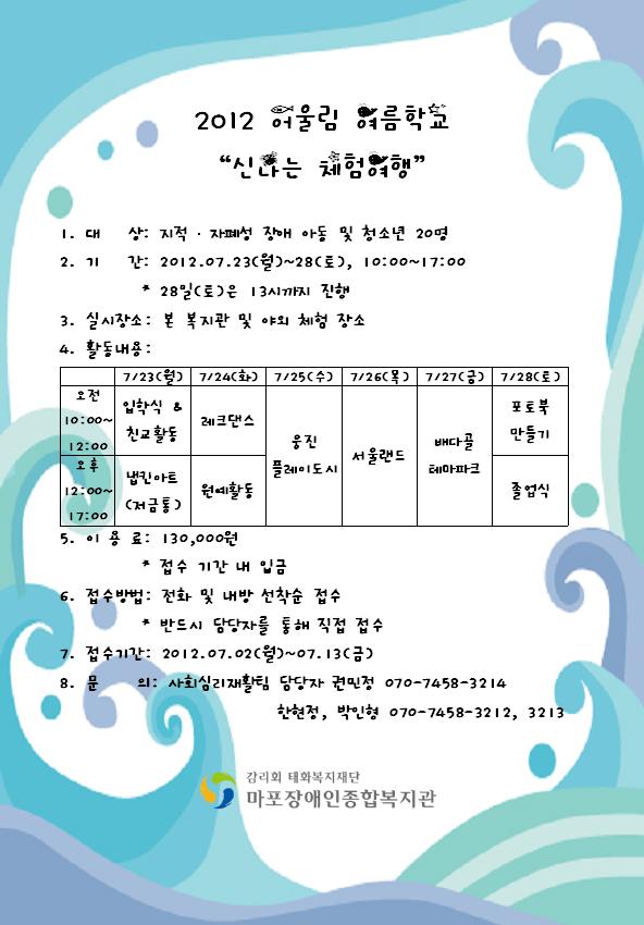 2012 어울림 여름학교 "신나는 체험여행" 이용자 모집 페이지 정보 작성자 권민정 댓글 0건 조회 9,457회 작성일 12-06-29 09:31 목록 본문 . 목록 이전글 여름철 폭염 피해 예방법 12.07.02 다음글 장애인가족 테마여행 선정 결과 12.06.27 댓글 0 댓글목록 등록된 댓글이 없습니다.