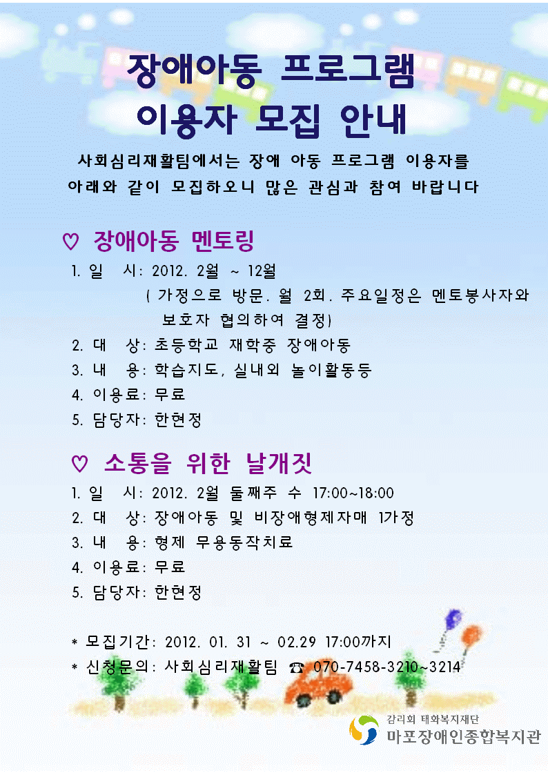 사회심리재활팀에서는 장애아동 프로그램 참가자(이용자)를 위와 같이 모집합니다