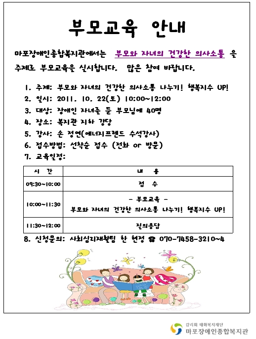 우리 복지관에서는 10.22(토) "부모와 자녀의 건강한 의사소통 나누기"를 주제로 아래와 같이 부모교육을 실시합니다.
