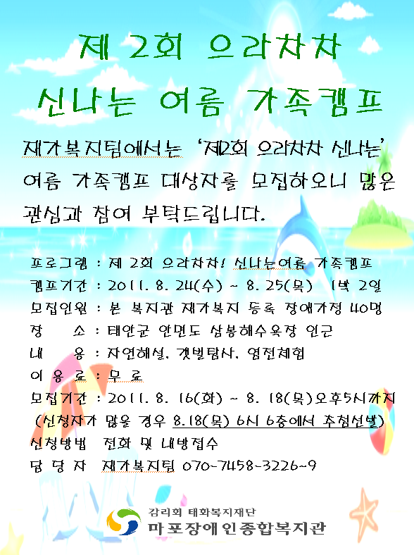 2011년 재가복지팀 제2회 으라차차 신나는 여름가족캠프 페이지 정보 작성자 박진미 댓글 0건 조회 9,162회 작성일 11-08-16 18:03 목록 본문 목록 이전글 마포골프 아카데미 선수 모집 11.08.17 다음글 2011 마장복과 함께 하는 가족캠프 "우리 가족 추억 만들기" 안내 11.08.12 댓글 0 댓글목록 등록된 댓글이 없습니다.