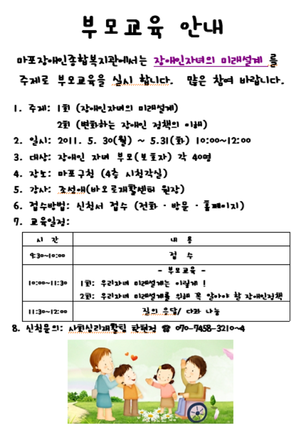 "장애인 자녀의 미래설계" 부모 교육 안내 페이지 정보 작성자 오은경 댓글 0건 조회 11,131회 작성일 11-05-04 13:23 목록 본문 목록 이전글 숭문고와 함께하는 신나는 토요일 5월 일정안내 11.05.09 다음글 목욕탕 임시휴무 안내 11.04.28 댓글 0 댓글목록 등록된 댓글이 없습니다.