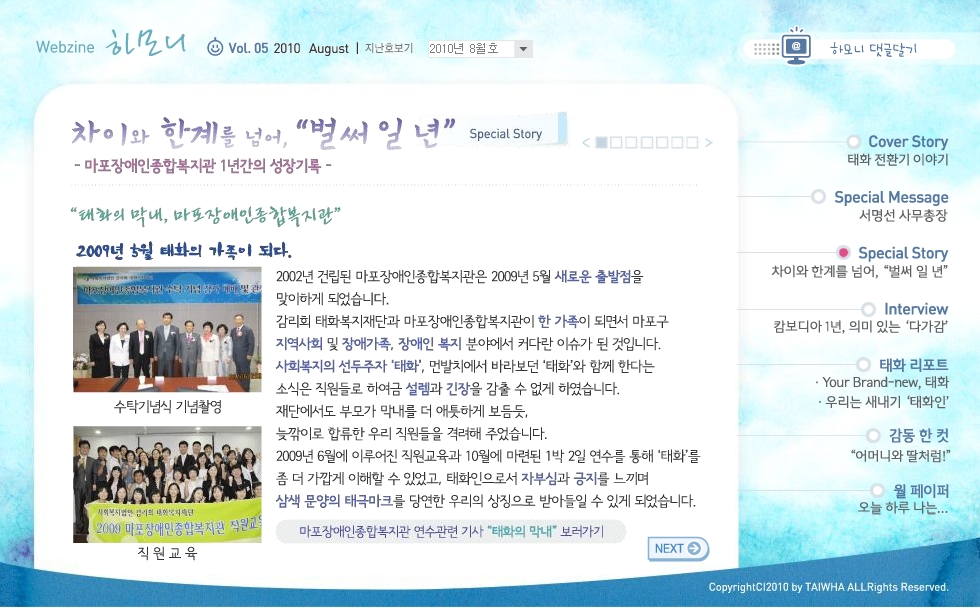 법인 홈페이지 복지관 기사 페이지 정보 작성자 권오성 댓글 1건 조회 13,704회 작성일 10-08-02 12:48 목록 본문 목록 관련링크 http://www.taiwhafound.org/wooyeoncokr/harmony/201008/main/main.php 5662회 연결 이전글 여름철 식중독 예방 10.08.02 다음글 청소년 장애체험 기사 10.08.02 댓글 1 댓글목록 권오성님의 댓글 권오성 작성일 10-08-02 12:52 링크된 주소를 클릭하세요. 링크된 주소를 클릭하세요.