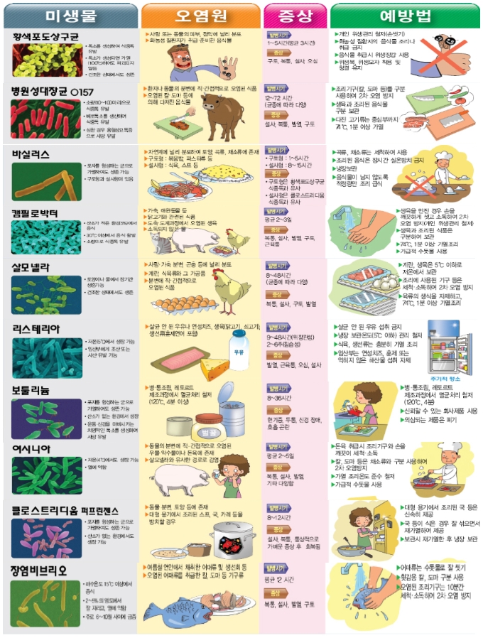 요즘은 계절에 상관 없이 수시로 식중독 환자가 발생하지만, 점차 기온이 높아지는 여름철이나 장마철이 다가오면 어느 때 보다도 식중독 예방에 대한 관심이 높아지게 된다. 세계보건기구(WHO)에서 “식품 또는 물의 섭취에 의해 발생되었거나 발생된 것으로 생각되는 감염성 또는 독소형 질환”으로 규정한 식중독은 여름철 가장 주의해야 할 질환 중 하나로 음식의 준비와 섭취 시 특히 주의가 요구된다.(출처:식품의약품안전청)