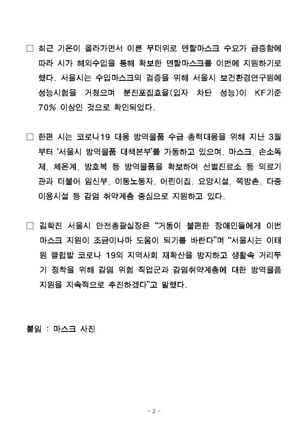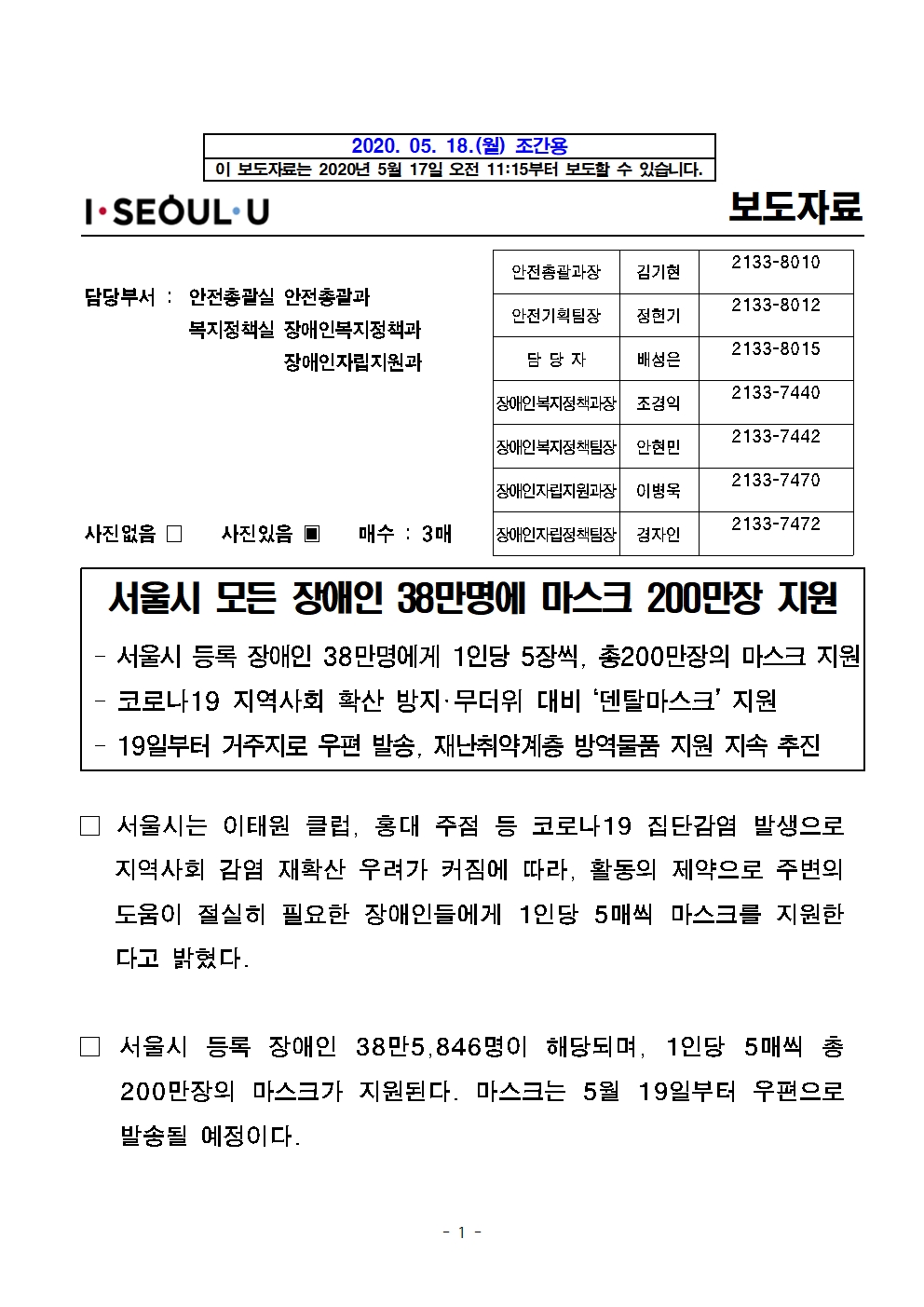 코로나19 관련 보도자료_서울시 모든 장애인 38만명에 마스크 200만장 지원 페이지 정보 작성자 이다은 댓글 0건 조회 7,993회 작성일 20-05-20 09:50 목록 본문 . 목록 이전글 (행사안내) 2020년 제15회 대한민국 보조공학기기 박람회 안내 20.05.21 다음글 코로나19 관련_슬기로운 긴급재난지원금 사용방법! 20.05.19 댓글 0 댓글목록 등록된 댓글이 없습니다.