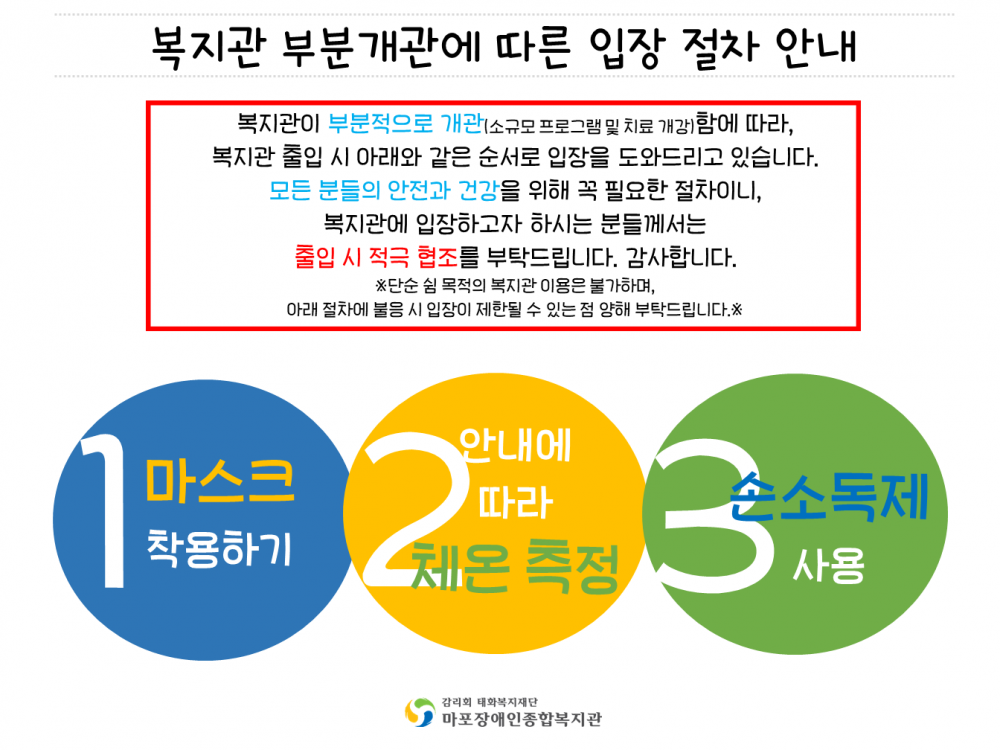 복지관 부분적 개관에 따른 입장 절차 안내 페이지 정보 작성자 이다은 댓글 0건 조회 8,013회 작성일 20-05-27 14:21 목록 본문 - 목록 이전글 마포장애인종합복지관 부분 운영 안내 20.05.29 다음글 코로나19관련_스토리툰-건강을 지키는 새로운 일상 '코로나19 생활 속 거리 두기' 20.05.27 댓글 0 댓글목록 등록된 댓글이 없습니다.