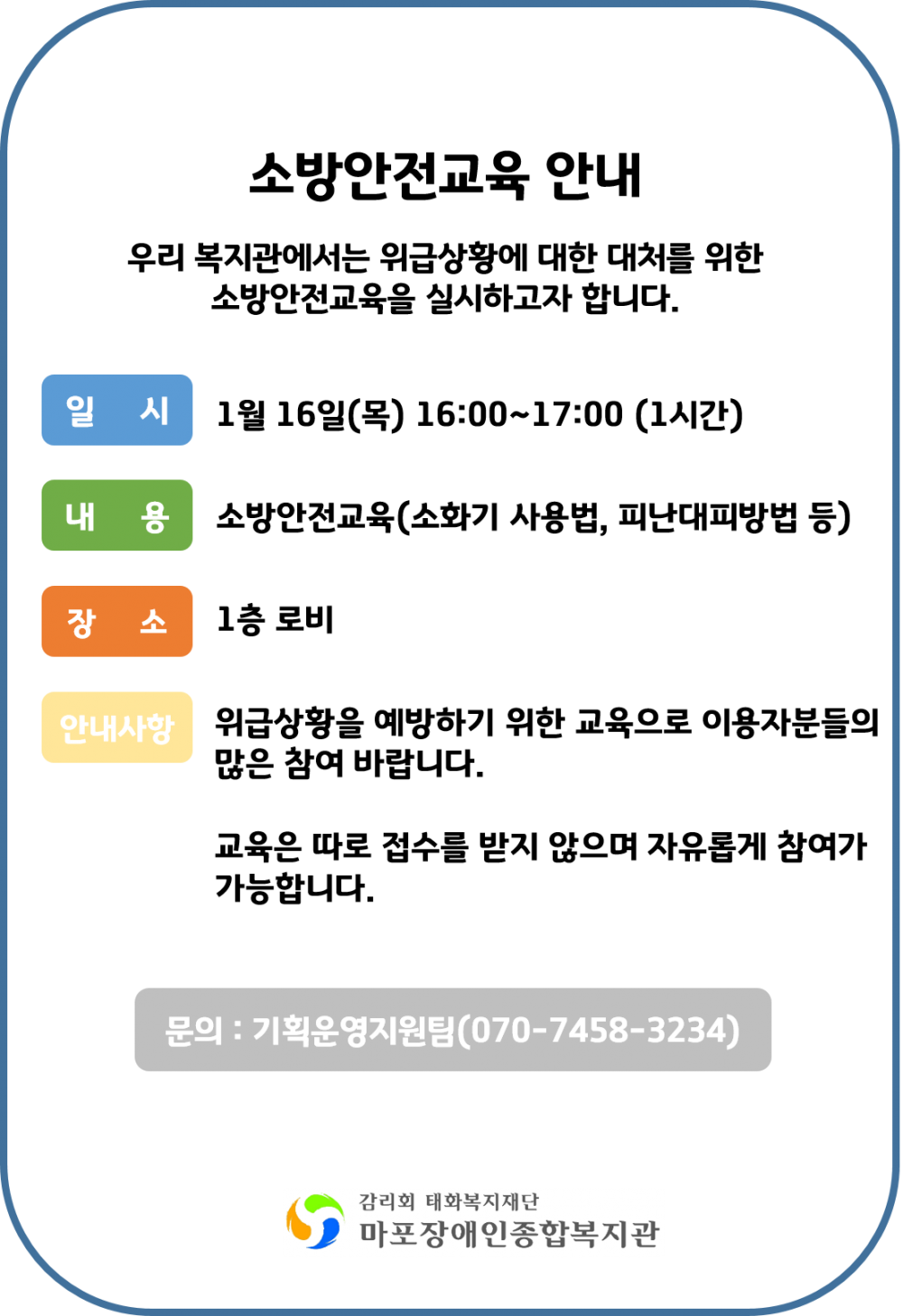 소방안전교육 이용자 모집 페이지 정보 작성자 최재민 댓글 0건 조회 8,152회 작성일 20-01-08 11:53 목록 본문 목록 이전글 지역주민과 '함께' 하는데이 설날 행사 실시 20.01.09 다음글 재활바우처사업 언어재활사 최종 합격자 발표 20.01.03 댓글 0 댓글목록 등록된 댓글이 없습니다.