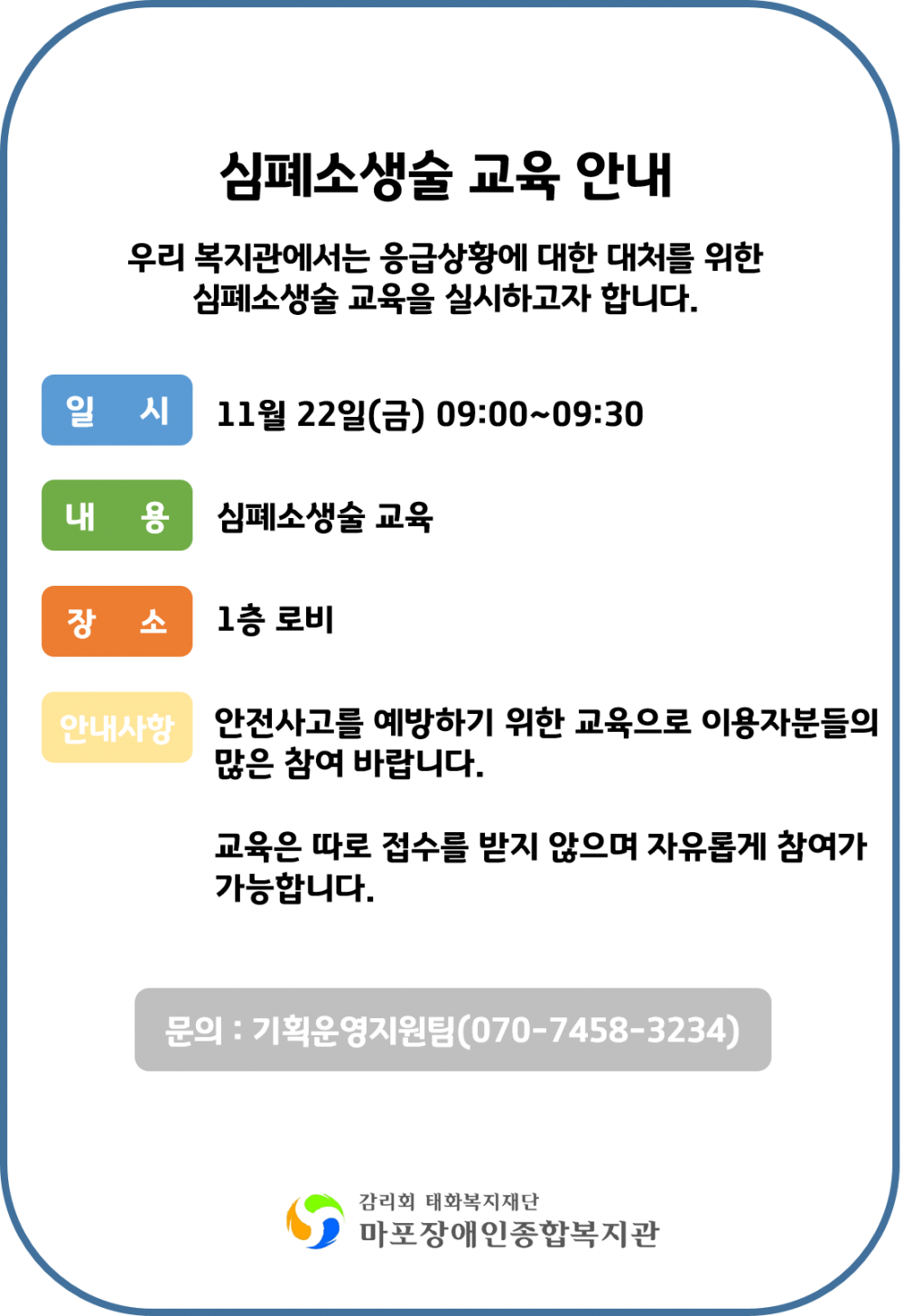 심폐소생술 교육 안내 페이지 정보 작성자 최재민 댓글 0건 조회 9,079회 작성일 19-11-18 16:25 목록 본문 목록 이전글 마포장애인종합복지관 사회복지사(계약직) 최종 합격자 발표 19.11.26 다음글 제10회 훈숙장학재단 장학생을 모집합니다[마감] 19.11.15 댓글 0 댓글목록 등록된 댓글이 없습니다.