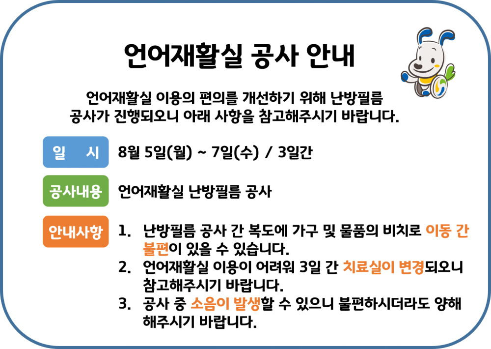 언어재활실 공사 안내(8/5~7) 페이지 정보 작성자 최재민 댓글 0건 조회 12,433회 작성일 19-08-01 10:34 목록 본문 목록 이전글 광복절 휴관 안내 19.08.14 다음글 마포장애인종합복지관 장애인재활상담사 채용공고 19.07.30 댓글 0 댓글목록 등록된 댓글이 없습니다.