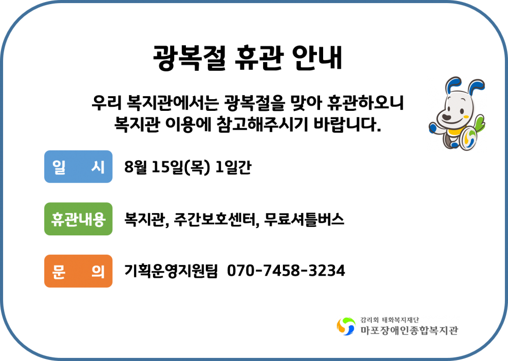 광복절 휴관 안내 페이지 정보 작성자 최재민 댓글 0건 조회 11,956회 작성일 19-08-14 15:48 목록 본문 목록 이전글 2019년 2학기 사회복지 현장 실습생 합격자 발표 19.08.20 다음글 언어재활실 공사 안내(8/5~7) 19.08.01 댓글 0 댓글목록 등록된 댓글이 없습니다.