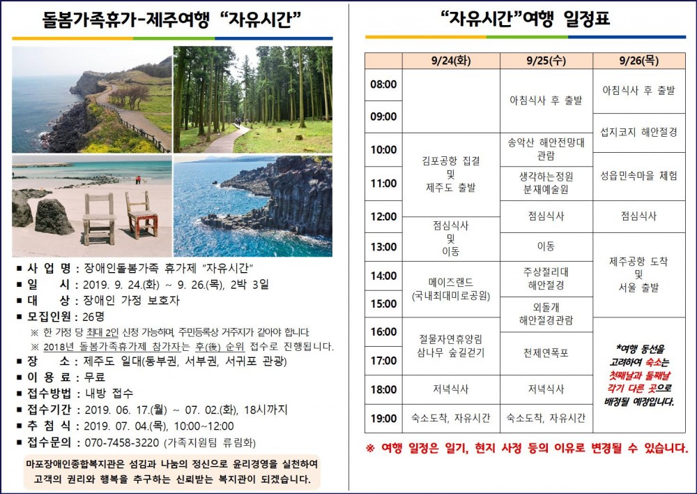 장애인돌봄가족 휴가제 "제주여행 『자유시간』" 참가자 모집