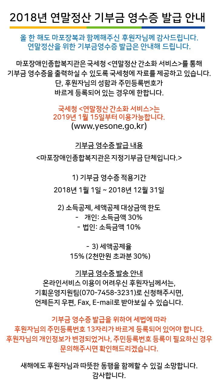 2018년 기부금 영수증 발급 안내 페이지 정보 작성자 박인형 댓글 0건 조회 11,207회 작성일 18-12-04 16:40 목록 본문 . 목록 이전글 제9회 훈숙장학재단 장학생 선발 결과 18.12.06 다음글 발달장애인 요양보호사 보조일자리사업 참여자 모집공고 18.12.04 댓글 0 댓글목록 등록된 댓글이 없습니다.