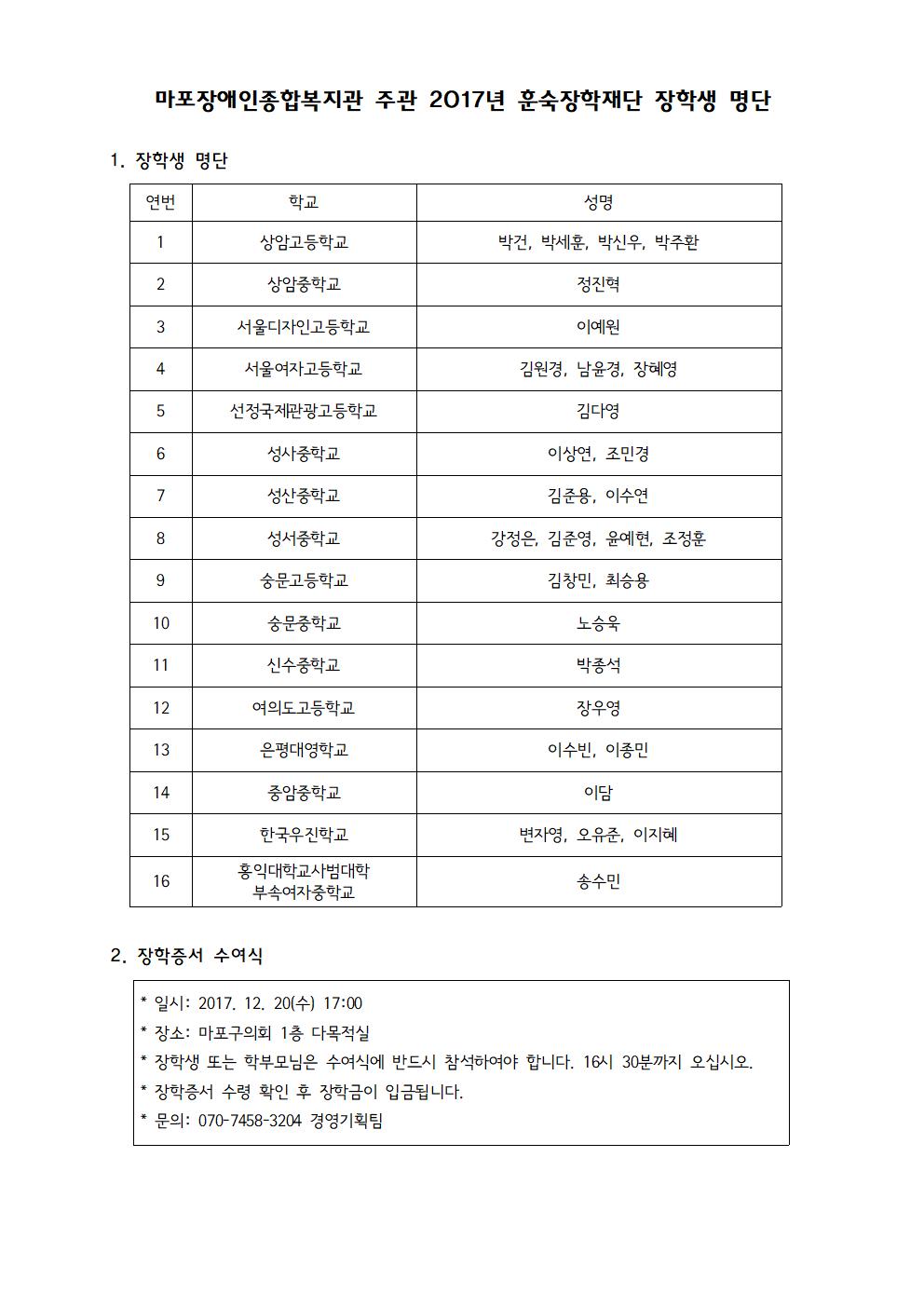제8회 훈숙장학재단 장학생 선발 결과