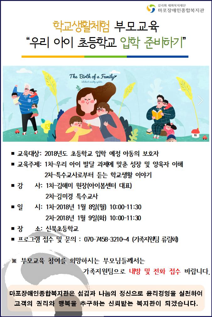 부모교육 "우리 아이 초등학교 입학 준비하기" 참여자 모집 페이지 정보 작성자 류림화 댓글 0건 조회 9,904회 작성일 17-12-13 14:53 목록 본문 * 그림을 클릭하시면 크게 보실 수 있습니다. 목록 이전글 2017년 기부금 영수증 발급 안내 17.12.21 다음글 조리사 채용 공고 17.12.13 댓글 0 댓글목록 등록된 댓글이 없습니다.