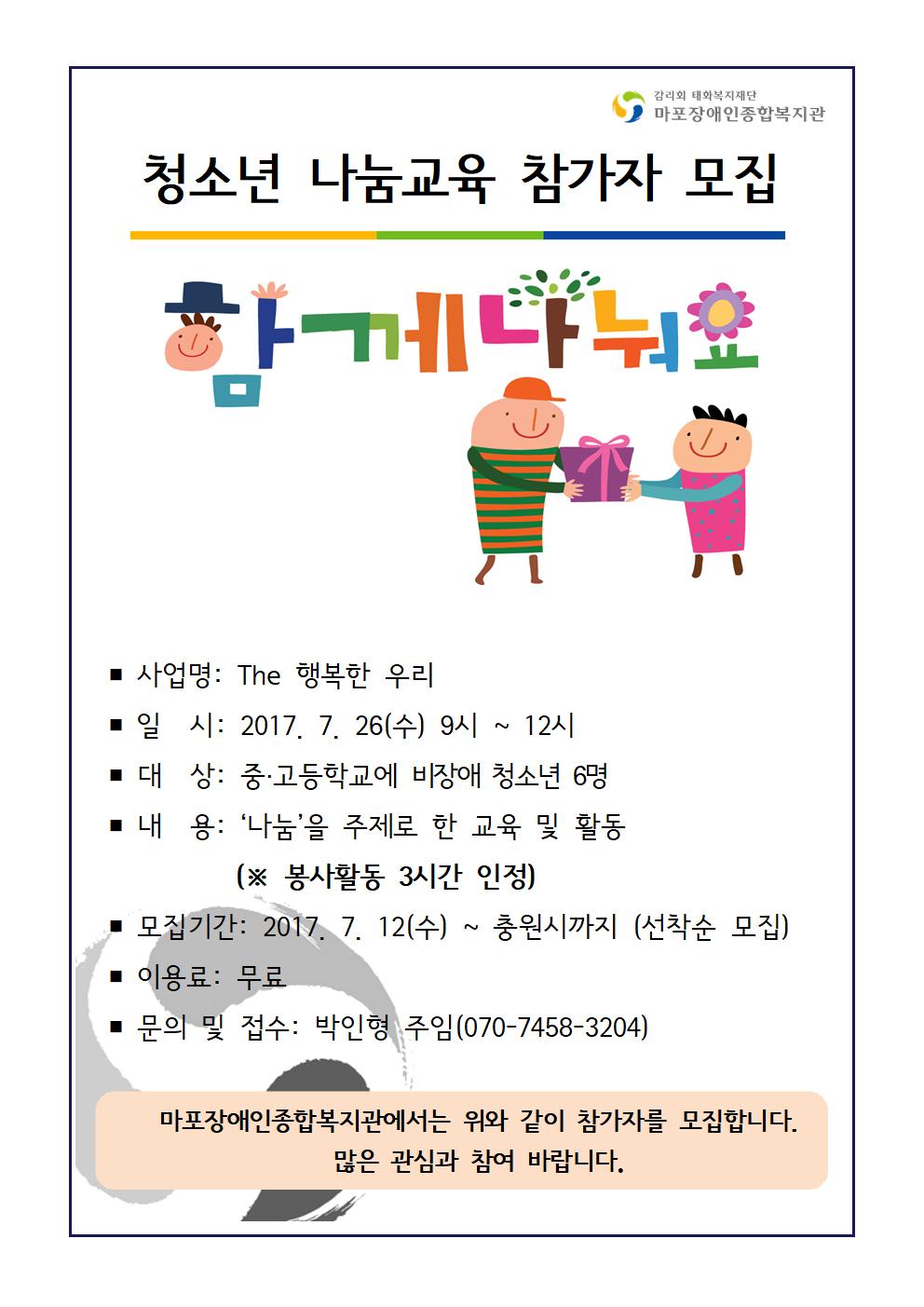 청소년 나눔교육 참가자 모집 (봉사시간 인정) 페이지 정보 작성자 박인형 댓글 0건 조회 12,191회 작성일 17-07-11 14:41 목록 본문 . 목록 이전글 2017년 2학기 실습생 모집 공고 17.07.12 다음글 2017 여름 계절학교 17.07.07 댓글 0 댓글목록 등록된 댓글이 없습니다.