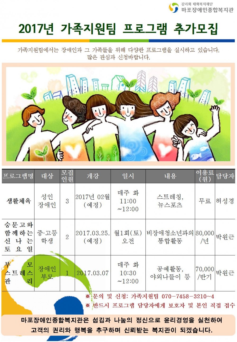 2017년 가족지원팀 프로그램 이용자 추가모집 페이지 정보 작성자 류림화 댓글 0건 조회 9,772회 작성일 16-12-19 17:55 목록 본문 가족지원팀에서는 아래와 같이 2017년 가족지원팀 프로그램 이용자를 추가모집합니다 . 많은 관심과 참여 부탁드립니다^^ 목록 이전글 단기계약직 모집 16.12.26 다음글 셔틀버스 12월 19일 5회차 운휴 16.12.19 댓글 0 댓글목록 등록된 댓글이 없습니다.