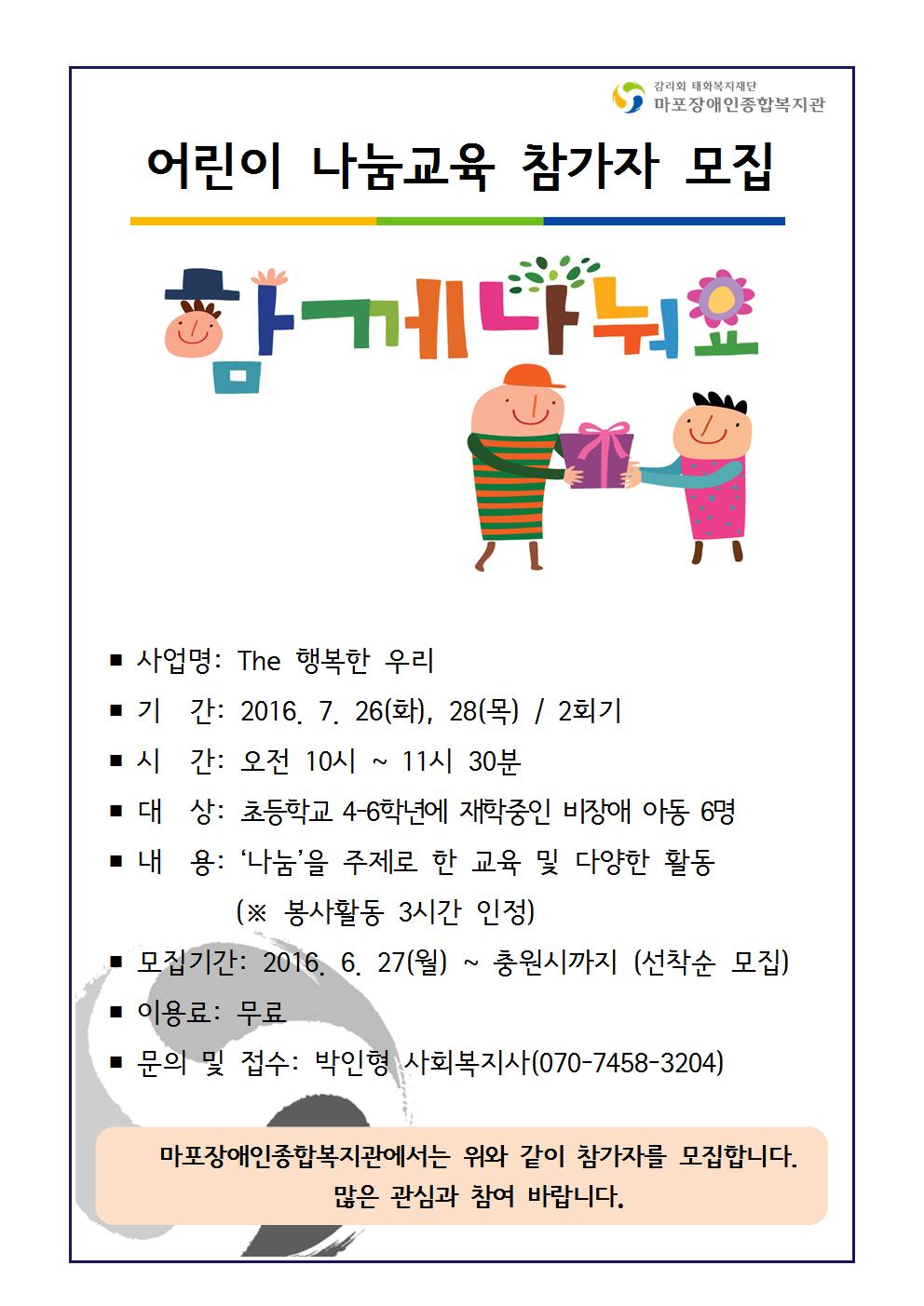 어린이 나눔교육 "The 행복한 우리" 참가자 모집 페이지 정보 작성자 박인형 댓글 0건 조회 9,841회 작성일 16-06-30 12:00 목록 본문 . 목록 이전글 2016년 2학기 사회복지 현장실습생 모집 16.07.11 다음글 제5회 장미콘서트에 장애인가족 및 지역주민 여러분을 초대합니다~ 16.06.16 댓글 0 댓글목록 등록된 댓글이 없습니다.