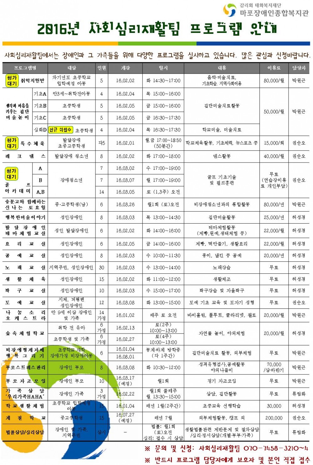 2016년도 아동, 청소년, 성인, 가족지원 프로그램 및 개강 안내입니다.