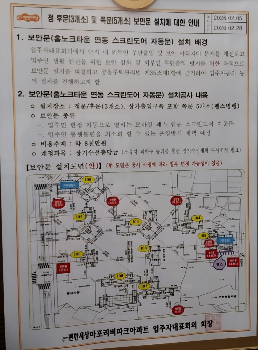 1. 최근 위 소재지 아파 트후문 인도 및 출입문 앞에 아파트입주가대표회의에서 펜스를 설치하려 한다는 사실을 알게 되었습니다.
