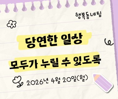 (마감) 장애인 가족나들이 "함께 행복해 봄" 참가자 모집 (마감) 제46회 장애인의 날 기념 장애인식개선캠페인 안내 이상현의 장애청소년 문화체육활동 지원사업 '컬처잇다' 7회기 참여자 모집 2026 생활문해교실 참여자 추가 모집 2026년 함께배움팀 프로그램 참여자 추가 모집 안내 2026년 서울시 장애인돌봄가족휴가제 참여자 모집 2026년 4월 바리스타 체험 참여자 모집 ♥청소년 디지털 교실 참여자 추가모집♥ 누구나 운동센터(공덕) 그룹체육3 추가 개설 및 참가자 모집 안내 생태학교 참여자 추가 모집 2026년 성인디지털교실 참여자 모집 2026 생활문해교실 참여자 모집 2026년 장애·비장애 청소년 즐거움 잇기 [라온: Round ON] 참여자 모집 2026년 '청소년 디지털 교실' 참여자 모집 2026년 중증뇌병변장애인 프로그램 '마포꿈터' 참여자 모집 2026년 3월 마이스터패스 C반(서현교회 카페 취업_바리스타) 참여자 모집 이상현의 장애청소년 문화체육활동 지원사업 '컬처잇다' 6회기 참여자 모집 2026년 복지일자리(문화예술) 2차 참여자 모집 ♥아동집단미술 참여자 추가모집♥ 누구나운동센터(공덕) 프로그램 추가 및 대기자 모집 장애인권교육 '나의 권리, 나의 목소리' 참여자 모집 ♥아동, 청소년 프로그램 참여자 추가모집♥ 2026년 선배학교 참여자 모집 누구나운동센터(공덕) 기획 프로그램「음악 줄넘기 교실」 이용자 모집 안내