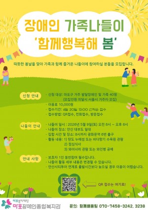 제46회 장애인의 날 기념 장애인식개선캠페인 안내 이상현의 장애청소년 문화체육활동 지원사업 '컬처잇다' 7회기 참여자 모집 2026 생활문해교실 참여자 추가 모집 2026년 함께배움팀 프로그램 참여자 추가 모집 안내 2026년 서울시 장애인돌봄가족휴가제 참여자 모집 2026년 4월 바리스타 체험 참여자 모집 ♥청소년 디지털 교실 참여자 추가모집♥ 누구나 운동센터(공덕) 그룹체육3 추가 개설 및 참가자 모집 안내 생태학교 참여자 추가 모집 2026년 성인디지털교실 참여자 모집 2026 생활문해교실 참여자 모집 2026년 장애·비장애 청소년 즐거움 잇기 [라온: Round ON] 참여자 모집 2026년 '청소년 디지털 교실' 참여자 모집 2026년 중증뇌병변장애인 프로그램 '마포꿈터' 참여자 모집 2026년 3월 마이스터패스 C반(서현교회 카페 취업_바리스타) 참여자 모집 이상현의 장애청소년 문화체육활동 지원사업 '컬처잇다' 6회기 참여자 모집 2026년 복지일자리(문화예술) 2차 참여자 모집 ♥아동집단미술 참여자 추가모집♥ 누구나운동센터(공덕) 프로그램 추가 및 대기자 모집 장애인권교육 '나의 권리, 나의 목소리' 참여자 모집 ♥아동, 청소년 프로그램 참여자 추가모집♥ 2026년 선배학교 참여자 모집 누구나운동센터(공덕) 기획 프로그램「음악 줄넘기 교실」 이용자 모집 안내 행복동네 나눔가게 식품, 생활 참여자 모집